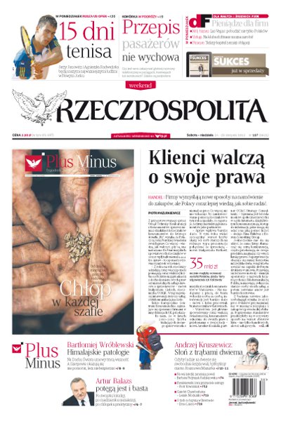 Klienci walczą o swoje prawa; w poniedziałek rusza US Open; przepis nie wychowa pasażerów; himalajskie patologie: na Dachu Świata umowy tracą ważność, a Szerpowie okazują się nie pomocni, lecz niebezpieczni; Artur Balazs potęgą jest i basta; Andrzej Kruszewicz: słoń z trąbami dwiema; Kościołem pokierują młodsi: na emeryturę odejdzie w najbliższym czasie aż 13 biskupów; przestępcy nowej generacji; człowiek nie może nawet spokojnie umrzeć; gorączka złota po rosyjsku.