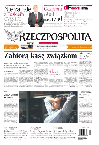 Zabiorą kasę związkom – tuż przed wrześniowymi strajkami posłowie PO chcą pozbawić związkowców źródeł utrzymania; „Nie zapalę z Tuskiem cygara” – Jarosław Gowin dla „Rzeczpospolitej”; „Gazprom obalił nasz rząd. Nie zdawałem sobie sprawy, że ktoś może tak sprawnie wywoływać strajki i niepokoje społeczne” – były wicepremier Bułgarii; „jOBS”, geniusz na ekranie – oczekiwana z dużym zainteresowaniem opowieść o Stevie Jobsie wchodzi w tym tygodniu do polskich kin; ostrzeżenie od Fitcha – agencja ratingowa Fitch, jedna z wielkiej trójki międzynarodowych agencji oceniających wiarygodność krajów, wystawiła nam ostrzegawczą żółtą kartkę; ochrona dla świadków – będzie łatwiej zeznawać przed sądem; dziś rusza turniej US Open – pierwszego dnia grają siostry Radwańskie.