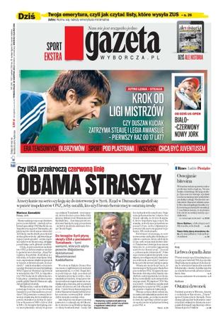 Obama straszy – czy USA przekroczą czerwoną linię – Amerykanie na serio szykują się do interwencji w Syrii, rząd w Damaszku zgodził się wpuścić inspektorów ONZ, żeby ustalili, kto użył broni chemicznej w ostatnią środę; twoja emerytura, czyli jak czytać listy, które wysyła ZUS; krok do Ligi Mistrzów – czy Duszan Kuciak zatrzyma Steauę i Legia awansuje, pierwszy raz od 17 lat; oswajanie bitcoina – wirtualna waluta sprawia realne problemy wielu rządom, nie ma banku centralnego, który ją emituje, fizycznie nie istnieje, a jednak można za nią kupować prawdziwe produkty i usługi; Steve Ballmer, odchodzący szef Microsoftu, w liczbach; nasze kluby płacą stosunkowo dużo, ale nasi piłkarze i tak są Kopciuszkami.