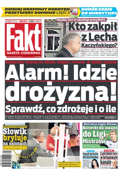 Alarm, idzie drożyzna – zapłacisz więcej za chleb, mięso i owoce, a także czynsz; kto zakpił z Lecha Kaczyńskiego – ohydny żart ze zmarłego prezydenta – w internecie pojawiło się zdjęcie okna kamienicy, gdzie mieszkał Lech Kaczyński – widać w nim ponoć profil prezydenta, ale cała sprawa to wyjątkowo głupi i niesmaczny żart z wielkiej tragedii; Słowik bryluje na salonach – nowe życie gangstera – słynny boss pruszkowskiej mafii nie ukrył się w cieniu po wyjściu z celi; Kosecki da awans do Ligi Mistrzów – Legia Warszawa gra dziś o historyczny awans; Kayah wróciła do kochanka – Pako Sarr znów dostał szansę od piosenkarki; „Ciało Iwony leży w betonowym kanale” – wstrząsająca wizja jasnowidza Jackowskiego.