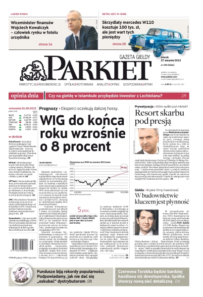 WIG do końca roku wzrośnie o 8 procent – eksperci oczekują dalszej hossy; wiceminister finansów Wojciech Kowalczyk, człowiek rynku w fotelu urzędnika; skrzydlaty Mercedes W110 kosztuje 100 tysięcy złotych, ale jest wart tych pieniędzy; opinia dnia – czy na giełdę w Istambule przybędzie inwestor z Lechistanu; resort skarbu pod presją – które spółki pójdą pod młotek; fundusze biją rekordy popularności – podpowiadamy, jak nie dać się „oskubać” dystrybutorom; Czerwona Torebka będzie bardziej handlowa niż deweloperska – spółka stworzy nową sieć detaliczną; w budownictwie kluczem jest płynność – w perspektywie do końca roku WIG-Budownictwo i WIG-Deweloperzy nie będą się raczej zachowywały istotnie lepiej od szerokiego rynku; Petrolinvest – kurs akcji firmy poszukującej ropy i gazu w Polsce i Kazachstanie nadal szuka dna.