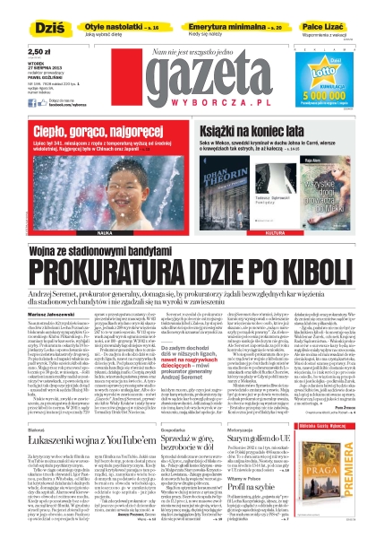 Prokuratura idzie po kiboli – Andrzej Seremet, prokurator generalny, domaga się, by prokuratorzy żądali bezwzględnych kar więzienia dla stadionowych bandytów i nie zgadzali się na wyroki w zawieszeniu; Łukaszenki wojna z YouTube’em – za krytyczny wobec władz filmik na YouTubie można znaleźć się w areszcie lub szpitalu psychiatrycznym; ciepło, gorąco, najgoręcej – lipiec był 341. miesiącem z rzędu z temperaturą wyższą od średniej wieloletniej – najgoręcej było w Chinach oraz Japonii; sprzedaż w górę, bezrobocie w dół – sprzedaż detaliczna w czerwcu wzrosła o 4,3 proc., najbardziej od blisko roku; starym golfem do UE – pod koniec 2012 r. na 1 tys. mieszkańców Polski przypadało 486 samochodów – to o dwa auta więcej niż wynosiła unijna średnia – niestety, nasze auto ma średnio 13-14 lat, podczas gdy w UE niewiele ponad osiem.