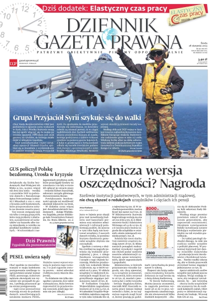 Urzędnicza wersja oszczędności to nagroda – szefowie instytucji państwowych, w tym administracji rządowej, nie chcą słyszeć o redukcjach urzędników i cięciach ich pensji; Grupa Przyjaciół Syrii szykuje się do walki – choć Rada Bezpieczeństwa ONZ jest podzielona w sprawie oceny wydarzeń w Syrii, USA i Wielka Brytania mogą bez jej zgody włączyć się do wojny po stronie opozycji; GUS policzył Polskę bezdomną, urosła w kryzysie – zwiększyła się liczba bezdomnych, nad Wisłą jest ich blisko 31 tys., 19 proc. więcej niż dwa lata temu; PESEL uwiera sądy – choć zgodnie ze znowelizowanym w maju kodeksem postępowania cywilnego to sąd powinien ustalać numer PESEL pozwanego, niektórym sędziom obowiązek ten wyraźnie nie przypadł do gustu i próbują przerzucić go na strony postępowania.