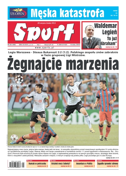 Żegnajcie marzenia – Legia Warszawa zremisowała z Steauą Bukareszt 2-2 (1-2), polskiego zespołu znów zabraknie w fazie grupowej Ligi Mistrzów; medal za szafą – Waldemar Legień, dwukrotny złoty medalista olimpijski, kończy dziś 50 lat i jeszcze długo żaden polski dżudoka jego osiągnięć nie powtórzy; zdenerwowali prezesa – negocjacje w sprawie transferu trwały, a Real już prezentował koszulkę Garetha Bale'a i zbudował trybunę honorową na jego powitanie – właściciel Tottenhamu powiedział dość; bardzo gorzka pigułka – Jerzy Janowicz przekonał się, że w tenisie nie można niczego przewidzieć i kalkulować – przegrał z kwalifikantem, Argentyńczykiem Maximo Gonzalezem.