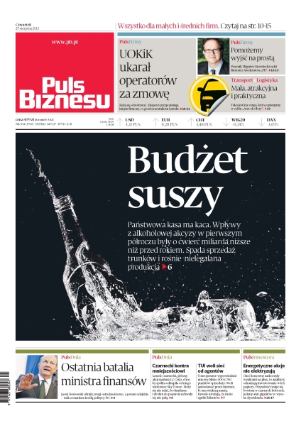 Budżet suszy – państwowa kasa ma kaca, wpływy z alkoholowej akcyzy w pierwszym półroczu były o ćwierć miliarda niższe niż przed rokiem – spada sprzedaż trunków i rośnie nielegalna produkcja; UOKiK ukarał operatorów za zmowę – będą się odwoływać, a eksperci przypominają innym firmom, co grozi uczestnikom kartelu; ostatnia batalia ministra finansów – Jacek Rostowski obniży progi ostrożnościowe, a potem odejdzie — taki scenariusz kreślą politycy PO; Czarnecki kontra mniejszościowi – Leszek Czarnecki, główny akcjonariusz LC Corp, chce, by spółka odkupiła od niego wieżowiec Sky Tower; TUI woli sieć od agentów – touroperator wypowiedział umowę blisko 500 z 750 punktów sprzedaży; energetyczne akcje nie elektryzują – choć koncerny zaskoczyły wynikami na plus, to analitycy odradzają inwestowanie w ich papiery – przyszłość rysuje się bowiem w czarnych kolorach.