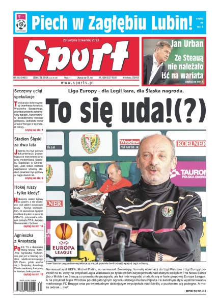 To się uda – Liga Europy, dla Legii kara, dla Śląska nagroda; „Ze Steauą nie należało iść na wariata” – Jan Urban; Szczęsny uciął spekulacje – trzy bardzo dobre występy bramkarza Arsenalu Wojciecha Szczęsnego prawdopodobnie pohamowały zapędy „Kanonierów” w poszukiwaniu nowego golkipera, jednakże trener Aresene Wenger w tej materii milczy; Stadion Śląski za dwa lata – jesienią ma być gotowa dokumentacja pozwalająca na wznowienie prac przy modernizacji Stadionu Śląskiego w Chorzowie; hokej ruszy, tylko kiedy – hokejowy sezon ligowy za pasem, a nie wiadomo pod jakimi auspicjami ruszy; Agnieszka z Anastazją – po wygranym meczu z Hiszpanką Marią-Teresą Torro-Flor, Agnieszka Radwańska jest już w trzeciej rundzie wielkoszlemowego US Open, gdzie spotka się z Rosjanką, Anastazją Pawluczenkową.