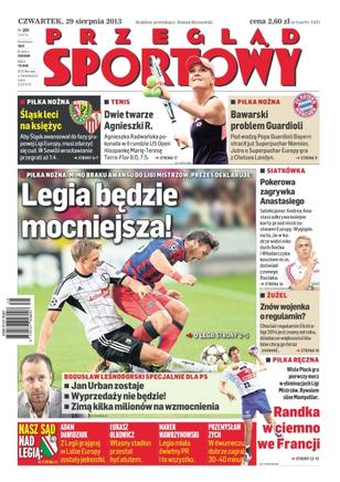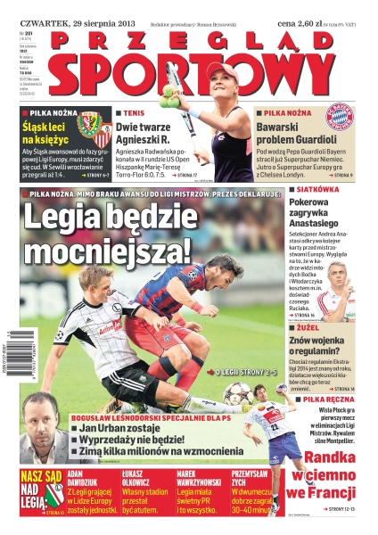 Legia będzie mocniejsza – mimo braku awansu do Ligi Mistrzów, prezes deklaruje: „Jan Urban zostaje, wyprzedaży nie będzie, zimą kilka milionów na wzmocnienia”; Śląsk leci na księżyc – aby Śląsk awansował do fazy grupowej Ligi Europy, musi zdarzyć się cud – w Sewilli wrocławianie przegrali aż 1-4; dwie twarze Agnieszki R. – Agnieszka Radwańska pokonała w II rundzie US Open Hiszpankę Marię-Teresę Torro-Flor; bawarski problem Guardioli – pod wodzą Pepa Guardioli Bayern stracił już Superpuchar Niemiec, jutro o Superpuchar Europy gra z Chelsea Londyn; pokerowa zagrywka Anastasiego – selekcjoner Andrea Anastasi odkrywa kolejne karty przed mistrzostwami Europy; randka w ciemno we Francji – Wisła Płock gra pierwszy mecz w eliminacjach Ligi Mistrzów, rywalem jest silne Montpellier.