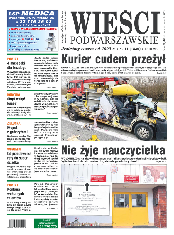 Wieści Podwarszawskie niezależny tygodnik lokalny, obszar powiat wołomiński, tematyka lokalna informacyjna, społeczno - kulturalna, sport, rozrywka, reklamy, ogłoszenia drobne. Ukazuje się w środy.