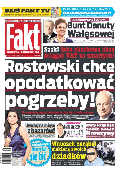 Rostowski chce opodatkować pogrzeby – szok, izba skarbowa chce ściągać VAT za zmarłych; uważaj na mięso z bazarów – trzymane w brudzie i na słońcu – bez badań i kontroli, takie mięso może cię zabić; „Nauczyłam się bić” – Karolina Gorczyca – śliczna aktorka dla roli jest gotowa na wiele poświęceń; rozwód Kupichy – fanki zniszczyły jego miłość; ZUS kupuje sobie nowe limuzyny – wydają nasze podatki na kolejne 74 auta; wnuczek zarąbał siekierą swoich dziadków – dziadkowie kochali Radosława S., a on za miłość odpłacił im okrucieństwem; bunt Danuty Wałęsowej – już nie sprząta Lechowi.