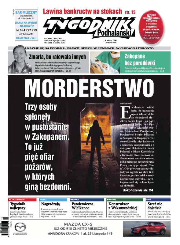 Trzy osoby spłonęły w pustostanie w Zakopanem. To już pięć ofiar pożarów, w których giną bezdomni; Czwarty raz w historii Tygodnik Podhalański najlepszą gazetą lokalną w Polsce; Przedsiębiorcy oszczędzają na wszystkim, a niektóre urzędy hojnie obdarowują swoich pracowników nagrodami; Konstruktor z Waksmundzkiej; Lawina bankructw na stokach; Zmarła, bo ratowała innych; Zakopane bez porodówki.