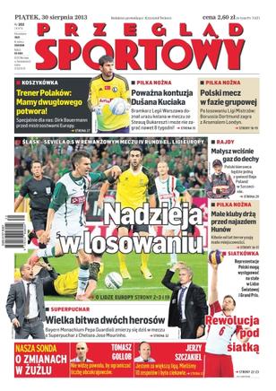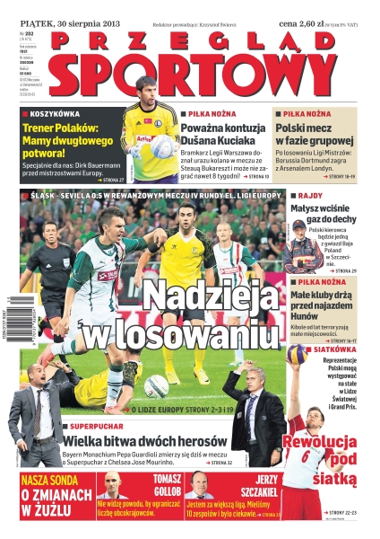 Nadzieja w losowaniu – Śląsk przegrał z Sevillą 0-5 w rewanżowym meczu IV rundy eliminacji Ligi Europy; wielka bitwa dwóch herosów – Bayern Monachium Pepa Guardioli zmierzy się dziś w meczu o Superpuchar z Chelsea Jose Mourinho; „Mamy dwugłowego potwora” – Dirk Bauermann przed mistrzostwami Europy; poważna kontuzja Dusana Kuciaka – bramkarz Legii Warszawa doznał urazu kolana w meczu ze Steauą Bukareszt i nie może grać nawet 8 tygodni; polski mecz w fazie grupowej – po losowaniu Ligi Mistrzów: Borussia Dortmund zagra z Arsenalem Londyn; Małysz wciśnie gaz do dechy – polski kierowca będzie jedną z gwiazd Baja Poland w Szczecinie; małe kluby drżą przed najazdem Hunów – kibole od lat terroryzują małe miejscowości; rewolucja pod siatką – Reprezentacje Polski mogą występować na stałe w Lidze Światowej i Grand Prix.