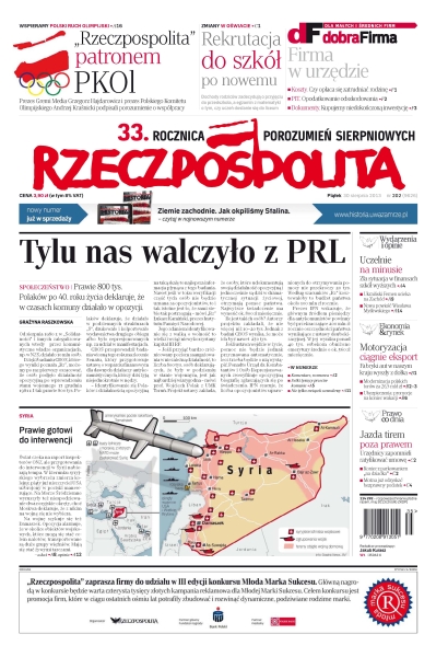 Tylu nas walczyło z PRL – prawie 800 tysięcy Polaków po 40. roku życia deklaruje, że w czasach komuny działało w opozycji; „Rzeczpospolita” patronem PKOl – prezes Gremi Media Grzegorz Hajdarowicz i prezes Polskiego Komitetu Olimpijskiego Andrzej Kraśnicki podpisali porozumienie o współpracy; rekrutacja do szkół po nowemu – dochody rodziców zadecydują o przyjęciu do przedszkola, a egzamin z matematyki o tym, czy uczeń dostanie się do liceum; prawie gotowi do interwencji – świat czeka na raport inspektorów ONZ, ale przygotowania do interwencji w Syrii nabierają tempa; uczelnie na minusie – zła sytuacja w finansach szkół wyższych; motoryzacja ciągnie eksport – fabryki aut w naszym kraju wyszły z dołka; jazda tirem poza prawem – urzędnicy zapomnieli ratyfikować umowę.