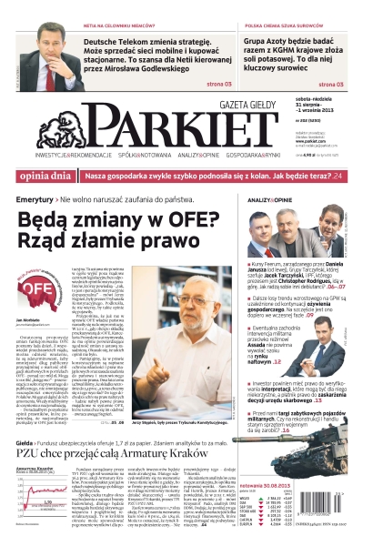 Będą zmiany w OFE? – rząd złamie prawo; nasza gospodarka zwykle szybko podnosiła się z kolan – jak będzie teraz; Deutsche Telekom zmienia strategię, noże sprzedać sieci mobilne i kupować stacjonarne – to szansa dla Netii; Grupa Azoty będzie badać razem z KGHM krajowe złoża soli potasowej – to dla niej kluczowy surowiec; PZU chce przejąć całą Armaturę Kraków.