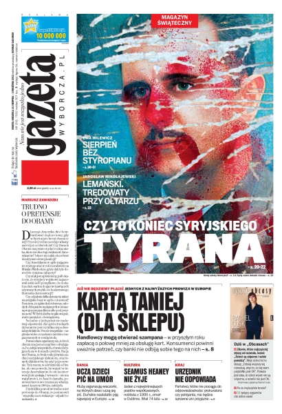 Handlowcy mogą otwierać szampana – w przyszłym roku zapłacą o połowę mniej za obsługę kart; kluby organizują wieczorki,na których dzieci uczą się pić – duńskie nastolatki piją najwięcej w Europie; Seamus Heaney – jeden z najwybitniejszych poetów współczesnych, noblista z 1995 r., zmarł w Dublinie; państwo, które nie pociąga do odpowiedzialności prokuratora czy policjanta, nie będzie sprawne ani przyjazne.