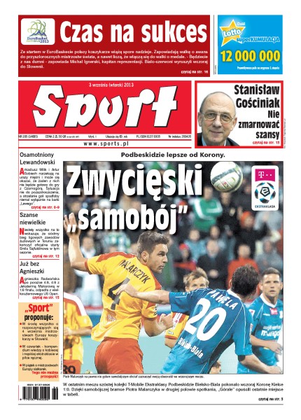W ostatnim meczu szóstej kolejki T-Mobile Ekstraklasa Podbeskidzie Bielsko-Biała pokonało wczoraj Koronę Kielce; Arkadiusz Milik i Artur Sobiech narzekają na urazy mięśni i może się okazać, że żaden z nich nie będzie gotowy do gry z Czarnogóra; Agnieszka Radwańska odpadła z wielkoszlemowego US Open