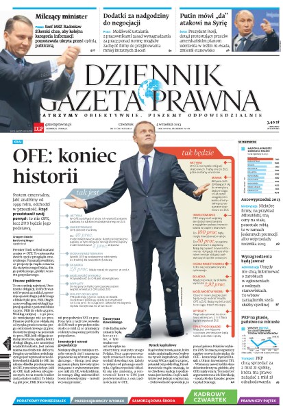 System emerytalny, jaki znaliśmy od 1999 roku, odchodzi w przeszłość – rząd przedstawił swój pomysł: to nie OFE, lecz ZUS będzie jego podstawą; Władimir Putin, dotąd protestujący przeciw amerykańskim planom uderzenia w reżim Al-Asada, zmienił stanowisko; szef MSZ Radosław Sikorski chce, aby kolejna kategoria informacji pozostawała ukryta przed opinią publiczną.
