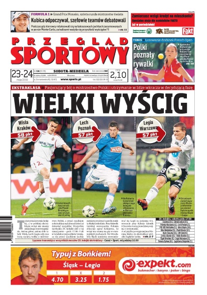 Bój o mistrzostwo Polski i utrzymanie w lidze wkracza w decydującą fazę; wywiad z Adamem Banasiem, obrońcą Górnika Zabrze; o jakie cele walczą zespoły ekstraklasy i na co mogą liczyć w dwóch ostatnich kolejkach; Wolfsburgowi do zdobycia pierwszego w historii mistrzostwa Niemiec wystarczy remis z Werderem Brema; Agnieszka Radwańska ma łatwy początek turnieju, Urszula i Marta Domachowska też nie są bez szans; już w niedzielę możemy poznać mistrza Polski w piłce ręcznej; Javier Sotomayor opowiada o miłości do Kuby i tajemnicy swoich sukcesów.