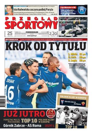 Tylko porażka ze Śląskiem może pozbawić Wisłę mistrzostwa, Legia już bez szans; sześć subiektywnych topów 29. kolejki ekstraklasy; w ostatnich kolejkach ekstraklasy o niezdrową dramaturgię zadbali sędziowie; wywiad z Markiem Zieńczukiem; losy Cracovii i Górnika Zabrze nadal nie rozstrzygnięte; Widzew Łódź zapewnił sobie wczoraj awans do ekstraklasy; dziś w Paryżu zagra Agnieszka Radwańska, a wczoraj odpadła Marta Domachowska; wywiad z Robertem Kubicą; dyskobol Piotr Małachowski mógł w Halle złamać barierę 70 m.