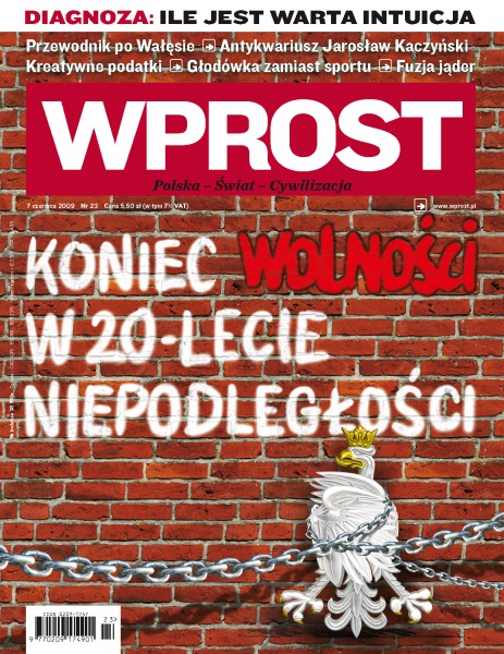 Co się stało z polską wolnością 20 lat po 4 czerwca 1989 roku, diagnoza „Wprost”: ile jest warta intuicja, przewodnik po Lechu Wałęsie, antykwariusz w polityce – sylwetka Jarosława Kaczyńskiego, w przyszłym roku w PZL Mielec rozpocznie się produkcja śmigłowców black hawk, do zachowania szczupłej sylwetki nie wystarczy sport – potrzebna jest głodówka, zalety porodów w domu, fizycy w USA chcą uzyskać syntezę termojądrową, po przegranej przez Niemców wojnie Czesi wzięli na nich odwet, dodatek o nieruchomościach „Oto dom”.