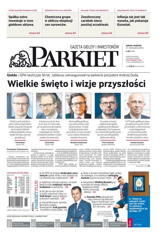 Największy w Polsce newsroom gospodarczy zbiera, analizuje i zgłębia dla Państwa najważniejsze informacje ze świata finansów. Codzienne wydanie „Parkietu”, sześć dni w tygodniu, to kilkadziesiąt artykułów o emitentach, instytucjach finansowych, gospodarce. To również opinie, felietony i wywiady z najważniejszymi ludźmi krajowej i globalnej finansjery.