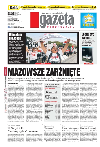 Najbogatsze województwo w Polsce de facto bankrutuje, zrujnowało je janosikowe, opłata wnoszona przez zamożniejsze samorządy na rzecz uboższych; ultimatum dla Asada – jeśli syryjski reżim w ciągu tygodnia odda swój chemiczny arsenał, do ataku nie dojdzie; przywileje mundurowych – jakie zmiany szykuje rząd; stypendia dla uczniów – jak się o nie starać; ZUS czy OFE – nie da się wybrać z sensem.
