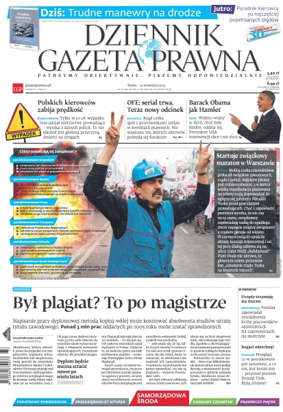 Polskich kierowców zabija prędkość – to nie alkohol jest główną przyczyną śmierci na drogach; OFE – rząd czeka spór z przeciwnikami zmian w kwestiach prawnych, nie wiadomo też, których aktywów pozbędą się fundusze; widmo wojny w Syrii, choć było bliskie, oddala się, prezydent USA interwencji chce i nie chce; startuje związkowy maraton w Warszawie; napisanie pracy dyplomowej metodą kopiuj-wklej może kosztować absolwenta studiów utratę tytułu zawodowego, ponad 3 mln prac oddanych po 2005 roku może zostać sprawdzonych.