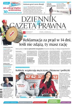 Nowe prawo to bat na opieszałość energetyków – koncerny się boją, że zaleją je skargi klientów; kobiety wypierają mężczyzn z biznesu i polityki; 20 tysięcy związkowców zajęło wczoraj Warszawę, rozpoczynając Ogólnopolskie Dni Protestu; Unia Europejska może zażądać oddania z odsetkami części dofinansowania wielu lokalnych inwestycji; czego nauczył nas upadek pięć lat temu banku inwestycyjnego Lehman Brothers.