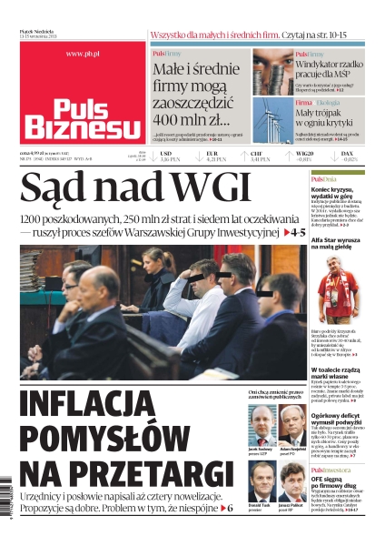 1200 poszkodowanych, 250 mln zł strat i siedem lat oczekiwania — ruszył proces szefów Warszawskiej Grupy Inwestycyjnej; przetargi – urzędnicy i posłowie napisali aż cztery nowelizacje, propozycje są dobre, problem w tym, że niespójne; OFE sięgną po firmowy dług; ogórkowy deficyt wymusił podwyżki; Alfa Star wyrusza na małą giełdę.