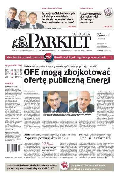 Prospekt emisyjny gdańskiej spółki energetycznej już w KNF – OFE mogą zbojkotować ofertę publiczną Energi; sytuacja spółek budowlanych w kolejnych kwartałach będzie się poprawiać; aktualne promocje biur maklerskich dla drobnych inwestorów; banki pozytywnie zaskakują rynek, a to jeszcze nie koniec; banki i produkty do regularnego oszczędzania.