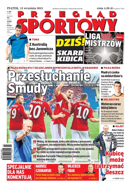 Kontuzja kręgosłupa wykluczyła Jerzego Janowicza z meczu z Australią w Pucharze Davisa; Gareth Bale na pierwszy trening w Realu Madryt ubrał się za tysiąc euro; polski hokej na lodzie czeka na szalonego milionera; Robert Kubica nie wie, czy stawi się na starcie Rajdu Polski; po 18 etapach Vuelta a Espana 42-letni Amerykanin Chris Horner traci tylko 3 sekundy do lidera Vincenzo Nibalego.