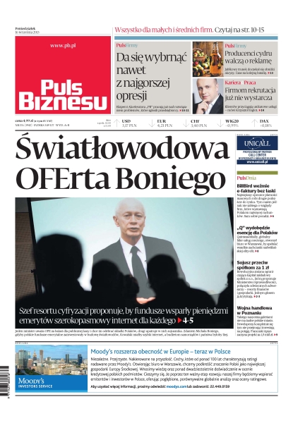 Światłowodowa OFErta Boniego – szef resortu cyfryzacji proponuje, by fundusze wsparły pieniędzmi emerytów szerokopasmowy internet dla każdego; da się wybrnąć nawet z najgorszej opresji – eksperci Akceleratora „PB” pracują już nad rozwiązaniem problemów, które zgłosili przedsiębiorcy; producenci cydru walczą o reklamę – jabłkowy trunek doczekał się obniżki akcyzy – czas na kolejną batalię; BillBird weźmie e-faktury bez łaski – największy operator płatności masowych robi drugie podejście do rynku – tym razem jednak nie zabiega o względy firm, które wystawiają Polakom najwięcej rachunków, sam sobie poradzi; „Q” wydobędzie esencję dla Polaków – Quintessentially, globalny lider usług concierge, otworzył biuro w Warszawie, by spełniać wszelkie zachcianki nadwiślańskiej elity elit; wojna handlowa w Poznaniu – takiego nasycenia galeriami nie ma żadne polskie miasto, deweloperzy kompletnie się tym nie przejmują i inwestują na potęgę – francuski Apsys zaczyna projekt za 1,5 mld zł.