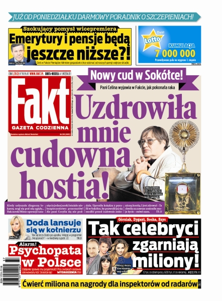 Szokujący pomysł wicepremiera – czy emerytury i pensje będą jeszcze niższe; pani Celina wyjawia w Fakcie, jak pokonała raka – czy uzdrowiła ją cudowna hostia; Doda lansuje się w kołnierzu; zobacz jak celebryci zgarniają grube miliony; psychopata w Polsce – zabijanie sprawia mu przyjemność, przy zwłokach zostawia zakrwawiony nóż; ćwierć miliona na nagrody dla inspektorów od radarów.