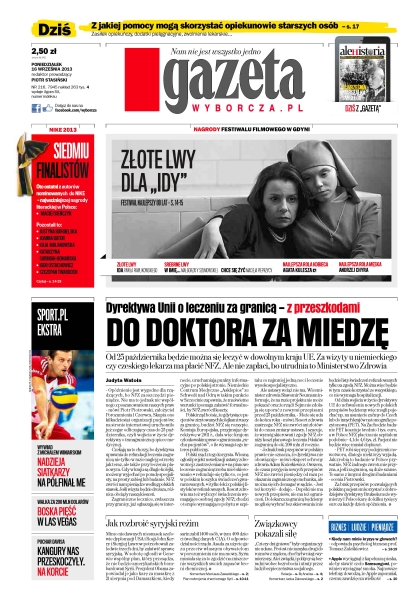 Do doktora za miedzę – dyrektywa Unii o leczeniu za granicą z przeszkodami – od 25 października będzie można się leczyć w dowolnym kraju UE – za wizyty u niemieckiego czy czeskiego lekarza ma płacić NFZ, ale nie zapłaci, bo utrudnia to Ministerstwo Zdrowia; z jakiej pomocy mogą skorzystać opiekunowie starszych osób – zasiłek opiekuńczy, dodatki pielęgnacyjne, zwolnienia lekarskie; jak rozbroić syryjski reżim – mimo niedawnych niesnasek szefowie dyplomacji USA i Rosji John Kerry i Siergiej Ławrow potrzebowali zaledwie trzech dni, by załatwić sprawę syryjską; związkowcy pokazali siłę – „Cztery dni gniewu” były organizacyjnie udane, protest nie zamyka drogi do rozmów z rządem, choć był wniego wymierzony.
