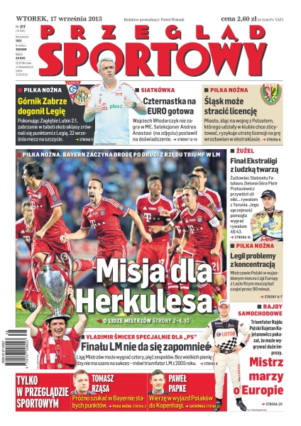 Misja dla Herkulesa – Bayern zaczyna drogę po drugi z rzędu triumf w Lidze Mistrzów; Górnik Zabrze dogonił Legię – pokonując Zagłębie Lubin 2-1, zabrzanie w tabeli ekstraklasy zrównali się punktami z Legią – 22 września mecz na szczycie; czternastka na Euro gotowa – Wojciech Włodarczyk nie zagra w ME, selekcjoner Andrea Anastasi postawił na doświadczenie; Śląsk może stracić licencję – miasto, idąc na wojnę z Polsatem, którego udziały w klubie chce zlicytować, ryzykuje utratę licencji na grę wrocławian w ekstraklasie; Legii problemy z koncentracją – Mistrzowie Polski w wyjazdowym meczu Ligi Europy z Lazio Rzym muszą być czujni przez 90 minut.