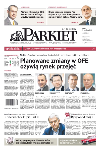 Planowane zmiany w OFE ożywią rynek przejęć – fundusze emerytalne będą chętniej sprzedawać pakiety w spółkach; Mariusz Klimczak z BOŚ – prezes banku, którego wizytówką jest ekologia; kto zastąpi Bena Bernanke – druga kadencja prezesa Fed upływa w styczniu, rosną szanse gołębicy Janet Yellen – akcje w górę; PKN Orlen chce kupić TriOil – inwestycja w Kanadzie za 563 mln złotych; lokaty progresywne dla osób, które nie wiedzą, kiedy wypłacą pieniądze; złoto – kruszec w tym roku potaniał już o ponad 20 procent, dystrybutorzy deklarują, że sprzedaż złota jest wyższa niż w ubiegłym roku; Mostostal Export – bez echa przeszła zapowiedź zarządu, że spółka zamierza pozyskać inwestora branżowego.