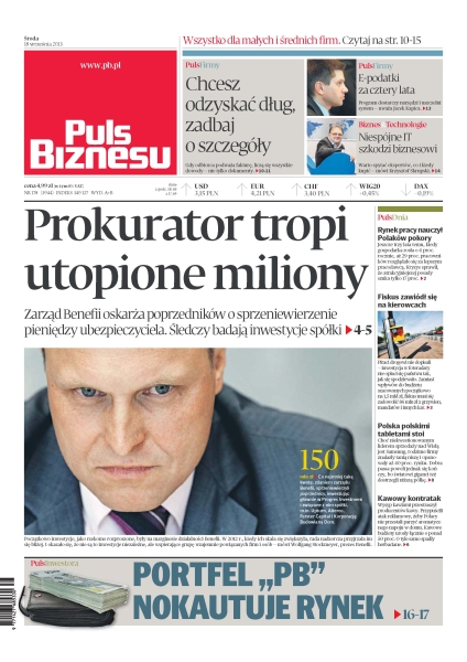 Prokurator tropi utopione miliony – zarząd Benefii oskarża poprzedników o sprzeniewierzenie pieniędzy ubezpieczyciela, śledczy badają inwestycje spółki; chcesz odzyskać dług, zadbaj o szczegóły – gdy odbiorca podważa fakturę, liczą się wszystkie dowody, nie tylko dokumenty; e-podatki za cztery lata – program dostarczy narzędzi i uszczelni system; rynek pracy nauczył Polaków pokory – jeszcze trzy lata temu, kiedy gospodarka rosła o 4 proc. rocznie, aż 29 proc. pracowników rozglądało się za lepszym pracodawcą; fiskus zawiódł się na kierowcach – piraci drogowi nie dopisali — inwestycja w fotoradary nie opłaci się państwu tak, jak się spodziewało, zamiast wpływów do budżetu szacowanych początkowo na 1,5 mld zł, fiskus musi się zadowolić 86 mln zł z grzywien, mandatów i innych kar.