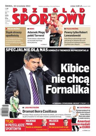 Kibice nie chcą Fornalika – specjalnie dla nas, sondaż o trenerze reprezentacji; Śląsk Wrocław straszy upadłością – coraz większe problemy wrocławskiego klubu, w którym kłócą się udziałowcy; „Mogę pobić Tarvera” – Tomasz Adamek odpowiada na zaczepki słynnego Amerykanina; pewny tylko Robert Lewandowski – Kuby Błaszczykowskiego może zabraknąć w składzie Borussii Dortmund w środowym meczu Ligi Mistrzów z Napoli; dramat Ikera Casillasa – bramkarz Realu wrócił po 237 dniach do składu, ale w meczu z Galatasaray (6:1) musiał w 13. min zejść z boiska z powodu kontuzji; Anastasi łowca medali w EURO – w rozpoczynających się w piątek mistrzostwach Europy siatkarzy Włoch może zdobyć 5. medal w karierze.
