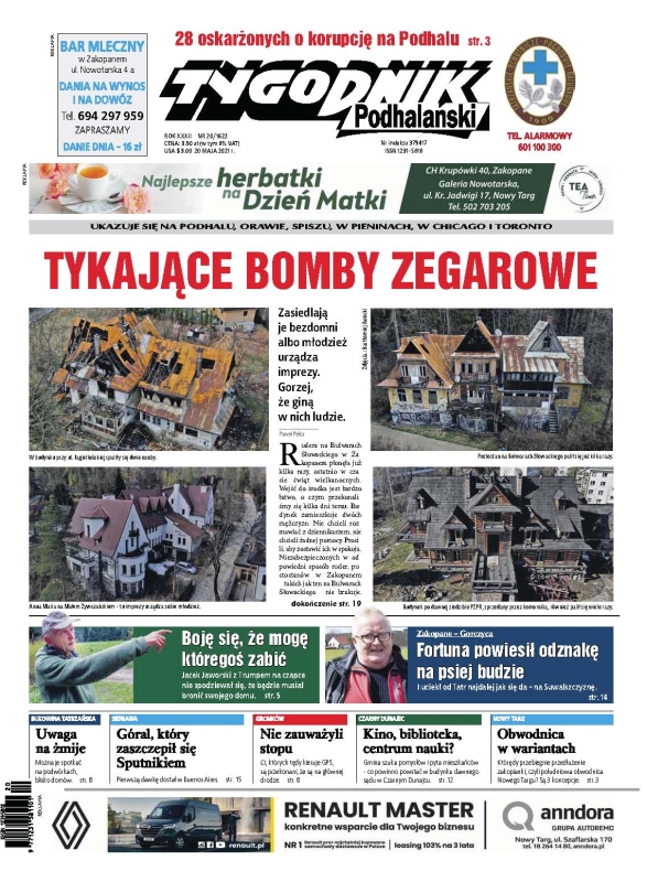 28 oskarżonych o korupcję na Podhalu; Zasiedlają je bezdomni albo młodzież urządza imprezy. Gorzej, że giną w nich ludzie; Uwaga na żmije – można je spotkać na podwórkach, blisko domów; Góral, który zaszczepił się Sputnikiem; Ci, których tędy kieruje GPS, są przekonani, że są na głównej drodze; Gmina szuka pomysłów i pyta mieszkańców - co powinno powstać w budynku dawnego sądu w Czarnym Dunajcu.