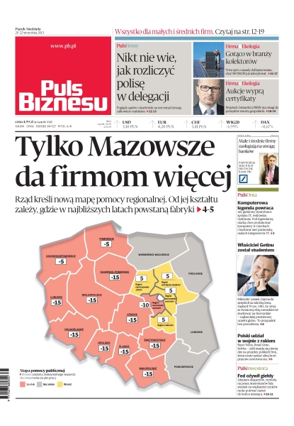 Tylko Mazowsze da firmom więcej – rząd kreśli nową mapę pomocy regionalnej, od jej kształtu zależy, gdzie w najbliższych latach powstaną fabryki; nikt nie wie, jak rozliczyć polisę w delegacji – poglądy sądów i skarbówki na ten temat bywają całkowicie rozbieżne; gorąco w branży kolektorów – trwa spór o zasady dofinansowania, choć NFOŚiGW już zdecydował; aukcje wyprą certyfikaty – Wojciech Cetnarski z PSEW ma uwagi do pomysłów resortu gospodarki; komputerowa legenda powraca – AB, giełdowy dystrybutor sprzętu IT, wskrzesza Optimusa; właściciel Getinu został studentem – miliarder Leszek Czarnecki zatęsknił za szkolną ławą, zapłacił 75 tys. USD, by wraz ze światową elitą menedżerów studiować na Harvardzie; Fed ożywił giełdy – zdaniem ekspertów, wywołana przez Amerykanów fala zwyżek na większości rynków może potrwać nawet do końca miesiąca.