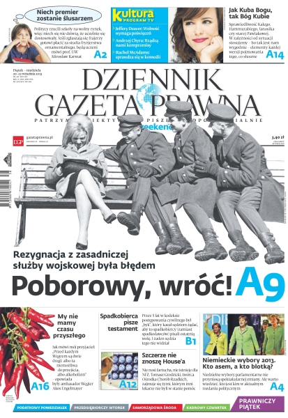 Poborowy, wróć – rezygnacja z zasadniczej służby wojskowej była błędem; niech premier zostanie ślusarzem – „Politycy rzucili szkoły na wolny rynek, więc niech się nie dziwią, że uczelnie się dostosowały. Jeśli zgłaszają się frajerzy gotowi płacić za studia fryzjerstwa ornamentalnego, będą uczeni” – mówi profesor UW Mirosław Karwat; jak Kuba Bogu tak Bóg Kubie – sprawiedliwość Kalego, Hammurabiego, Janosika czy starej Pawlakowej, w zależności od sytuacji stosujemy – bo tak jest nam wygodnie – elementy każdej wersji pojmowania tego, co słuszne; niemieckie wybory 2013, kto asem, a kto blotką – niedzielne wybory parlamentarne nie przyniosą spektakularnej zmiany, ale warto wiedzieć, kto jest kim w aktualnym rozdaniu politycznym.