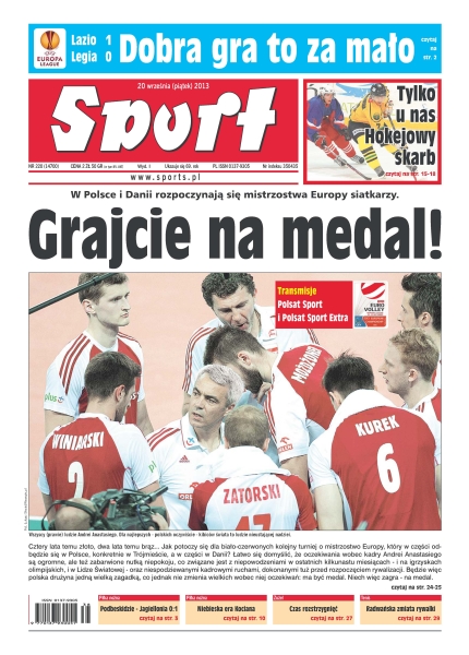 Grajcie na medal – w Polsce i Danii rozpoczynają się mistrzostwa Europy siatkarzy; Rzymu nie zdobyli – mistrzowie Polski przegapili swą szansę w pierwszej połowie, kiedy wyszli na drugą, mieli naprzeciw siebie Lazio grające już znacznie lepszą piłkę; maraton – jutro odbędą się derby Krakowa, a w niedzielę hit września, czyli mecz prowadzących w lidze Legii i Górnika; hokejowy skarb kibica – mniej gadania, więcej grania – przed sezonem bardziej było widać działaczy niż zawodników, teraz musi być odwrotnie; czy to ściana – siatkarze mówią o miejscu w czwórce, trener Anastasi marzy o zrobieniu zdjęcia drużynie na podium, a kibice mówią o złocie – wszystkim jednak ciążą ostatnie wyniki.
