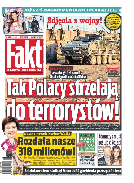 Tak Polacy strzelają do terrorystów, zdjęcia z wojny – krwaw bitwa trwała godzinami, nasi odparli atak talibów; Hanna Gronkiewicz-Waltz rozdała nasze 318 milionów – tak prezydent Warszawy szasta pieniędzmi podatników; „Zablokowałem stolicę! Mam dość gnębienia przez państwo. Politycy i banki doprowadzają mnie i innych do ruiny” – tłumaczy swój protest kierowca, który zastawił tirem rondo w Warszawie; alarm, sprzedają trujące grzyby – gdzie nie kupować; Piotr Adamczyk musi poślubić Weronikę Rosati – jeśli tego nie zrobi, może go spotkać sroga kara za wypadek.