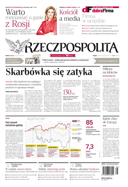 Skarbówka się zatyka – izby skarbowe nie nadążają z wydawaniem interpretacji, a wniosków przybywa w ogromnym tempie; Fed ożywił światowe giełdy – amerykański bank centralny będzie nadal pompował miliardy dolarów taniego pieniądza na rynki finansowe; Kijów chce do Europy – Ukraina ostatecznie wybrała integrację z UE – mimo nacisków Kremla rząd w Kijowie przyjął wczoraj projekt umowy stowarzyszeniowej, który zakłada m.in. utworzenie strefy wolnego handlu z Europą; warto rozmawiać o gazie z Rosji – „Za rok negocjatorzy mogą stanąć pod ścianą, i to lodowatą. A za ewentualne porażki zapłacimy wszyscy” – pisze była prezes PGNiG, Grażyna Piotrowska-Oliwa; Kościół a media – „Nie ma się co dziwić, że media wymagają od Kościoła hierarchicznego, aby dostosował swój język przekazu do obecnych wymagań” – pisze rzecznik Archidiecezji Krakowskiej ksiądz Robert Nęcek; miliony na kibiców – aż 330 mln zł wydała w ciągu 13 lat policja na zabezpieczenie meczów piłkarskich i konwojowanie kibiców.