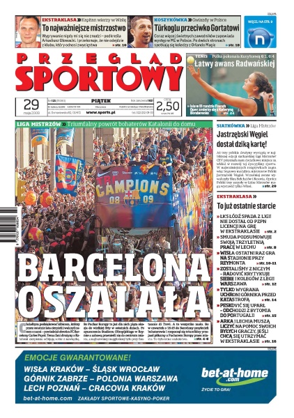 Triumfalny powrót bohaterów Katalonii do domu; ŁKS Łódź nie dostał od PZPN licencji na grę w ekstraklasie; trener Smuda podsumowuje swoją pracę w Lechu; Radović krytykuje siebie i kolegów z Legii Warszawa; tylko wygrana uchroni Górnika przed katastrofą; Wisła na cały sezon rozstaje się z obiektem przy Reymonta; Koszykarze Turcji, Litwy i Bułgarii z NBA i mocnych klubów Europy będą we wrześniu rywalami Polaków; RK Kart Team, zespół założony przez Roberta Kubicę ma sponsora.
