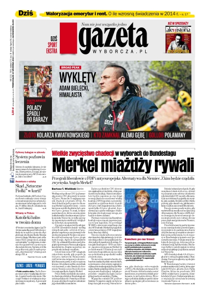Przegrali liberałowie z FDP i antyeuropejska Alternatywa dla Niemiec – z kim będzie rządziła zwycięska Angela Merkel; NFZ nie zamierza zmieniać programu eWUŚ; co najmniej 68 osób zginęło w centrum handlowym w stolicy Kenii, do którego wdarli się islamscy terroryści z Somalii; waloryzacja emerytur i rent w 2014 roku; czy Polacy są wynagradzani dostatecznie szczodrze; wspina się tak szybko, jakby się bał, że zabraknie mu czasu wejść wszędzie, gdzie by chciał – po tragicznej wyprawie na Broad Peak Adam Bielecki stał się himalaistą wyklętym, a w Polsce rozgorzała dyskusja: czy zasady etyczne przestają obowiązywać poza granicą 8000 m.