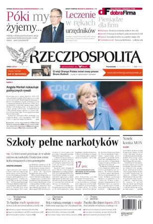 Kierowana przez panią kanclerz CDU/CSU zdecydowanie wygrała, zdobywając we wczorajszych wyborach do Bundestagu niemal 42 proc. głosów; co trzeci uczeń przyznaje, że w szkole zażywa się narkotyki – drastycznie rośnie liczba związanych z tym przestępstw; czy nagłe odwołanie szefa Służby Kontrwywiadu Wojskowego to efekt brutalnej wojny na haki; reforma Unii i relacje z Rosją – przed tymi strategicznymi wyzwaniami stanie nowy niemiecki rząd; politycy zachodni i opozycja ukraińska przekonywali w Jałcie prezydenta Janukowycza, by uwolnił Tymoszenko; Polacy pokonali Słowację 3:1 i we wtorek zagrają w barażu z Bułgarią.