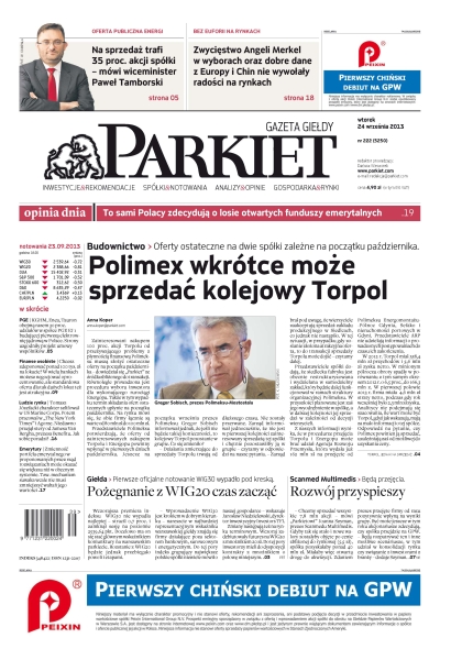 Polimex wkrótce może sprzedać kolejowy Torpol; WIG30 debiutancką sesję zakończył pod kreską; jeśli wyceny Energi i PKP Cargo będą atrakcyjne, nie będzie kłopotu z uplasowaniem miliardowych IPO; Peixin o czynnikach ryzyka; jedenaście złotych medali dla Intersportu; Tomasz Józefacki pracował w „The New York Times” i Agorze, niedawno przejął stery od Jamesa Van Bergha, szefa Benefit Systems; zwycięstwo niemieckiej pani kanclerz nie wprawiło inwestorów w euforię, podobnie jak dosyć dobre dane PMI z Niemiec, strefy euro i Chin.