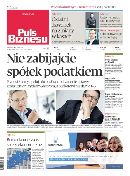 Przedsiębiorcy apelują do posłów o odrzucenie ustawy, która utrudni życie inwestorom, a budżetowi nie da nic; ostatni dzwonek na zmiany w kasach; teatry i muzea też potrzebują systemów ERP – mówi Zbigniew Rymarczyk; legendarny producent ciągników podpisał wart 90 mln USD kontrakt w Etiopii; stołeczny klub do zwycięstwa na boisku dorzucił prymat w rankingu finansowym; w ciągu roku globalne aktywa finansowe urosły o 8,1 proc., do rekordowych 111,2 bln EUR – najbogatsi są Szwajcarzy, którzy mają średnio 142 tys. EUR oszczędności, 27 razy więcej niż Polacy; 50-metrowe mieszkanie z basenem i blisko plaży można kupić w Tajlandii już za 100 tys. zł; komisja Europejska kończy ze wspieraniem dotacjami dużych firm, o ile nie będzie to ich pierwsza inwestycja w kraju.