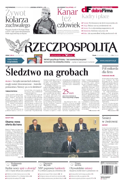 Jutro w Sejmie debata nad obywatelskim projektem zakazu przerywania ciąży – los ustawy w rękach posłów PO; niejasne procedury ekshumacyjne mogą wywołać międzynarodowy skandal; Iran chce uniknąć losu Syrii; Calypso potrafi zmieniać świat; znakomite zdjęcia wykonane przez Geralda Howsona w 1959 roku można oglądać od jutra w stołecznym Domu Spotkań z Historią; jak bezpiecznie wysłać ludzi na Marsa; zmarł Stanisław Szozda – w czasach Wyścigu Pokoju był jednym z najpopularniejszych polskich sportowców; Ekstraklasa SA planuje otwarcie własnego kanału telewizyjnego; nieoczekiwanie dla przedsiębiorców PARP zapowiada drugi ponadplanowy konkurs na najpopularniejsze granty z „Innowacyjnej gospodarki”.