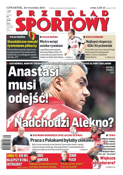 Odejście Andrei Anastasiego jest już raczej przesądzone – ma go zastąpić obcokrajowiec z najwyższej półki; trener Jan Urban obawiał się trudnego meczu – poszło mu dość łatwo, choć gospodarze walczyli do końca; Cracovia zagrała we Wrocławiu jak nigdy dotąd; czy obronę kadry warto budować w oparciu o duet stoperów: Glik – Krychowiak; Diego Costa wyrasta na jednego z czołowych napastników ligi – ma już na koncie tyle goli co Leo Messi; Serena Williams kończy dziś 32 lata, Roger Federer jest jej rówieśnikiem – oboje wygrali po 17 Wielkich Szlemów; właściciele Phoenix Suns szukają kupca na polskiego środkowego; trwa meczowy maraton Vive Targów i Orlenu Wisły; Bukmacherzy i fachowcy mieli rację – Tony Martin wygrał w cuglach tytuł mistrza świata w jeździe indywidualnej na czas.